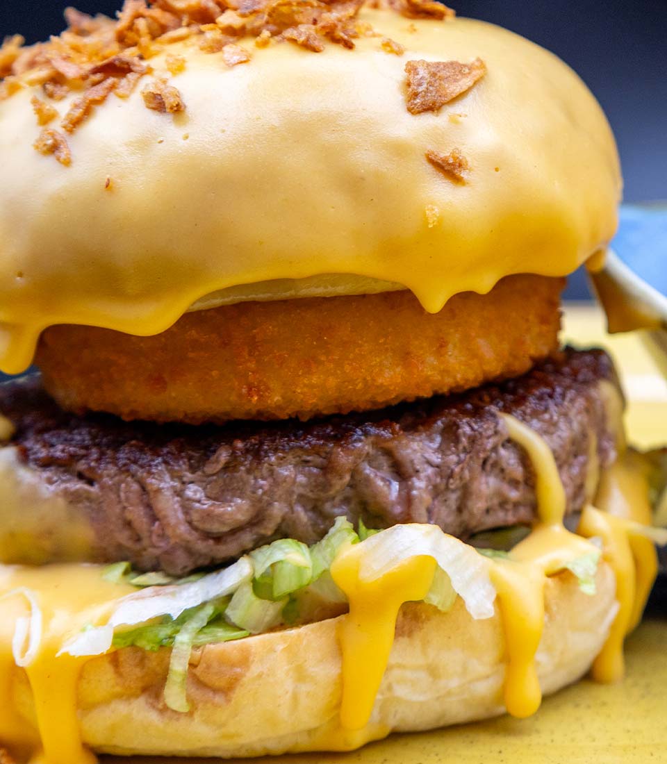 Bun brioché, sauce burger maison, salade, confit d’oignon, mozzarella panée, fromage du moment, steak haché, sauce cheddar à la bière maison, oignons frits