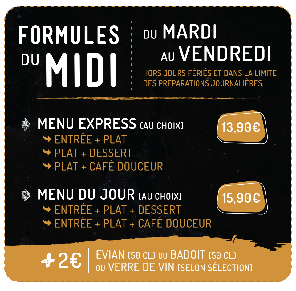 Plats accompagnés de frites maison/salade ou garniture du moment. Sauce au choix (supp.) : cajun, poivre, roquefort.